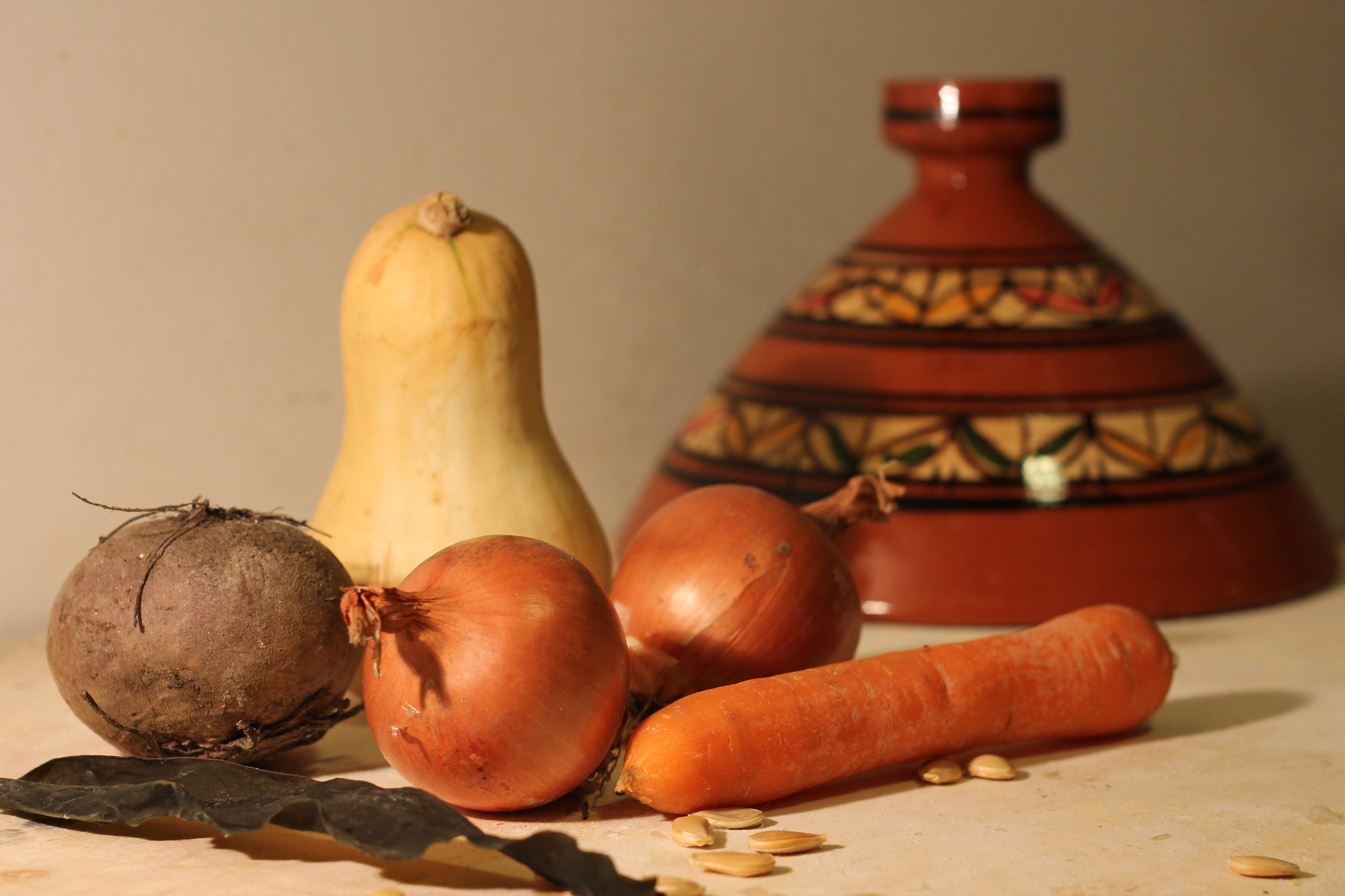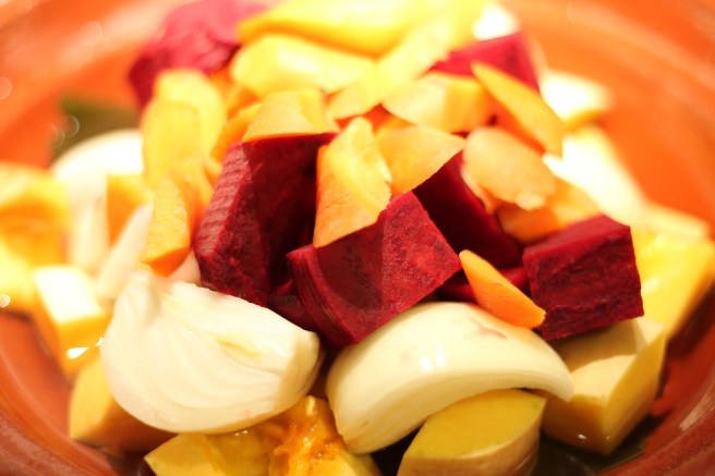 Mi rendo conto che lo scatto non è proprio il massimo, ma appena prenderò confidenza con la macchina fotografica, e imparerò un po’ di tecnica, sarò in grado di fare foto migliori, promesso!  Tornando al piatto, questo l’ordine che ho dato alle verdure: la carota che è una radice è stata l’ultima a entrare in pentola; in basso ho posto l’alga Kombu, annegata da un dito d’acqua, e poi è stato il turno della  zucca, quindi della cipolla, della la rapa e in fine, per l’appunto, ho messo la carota. Vietato mescolare! Tutto deve essere stabile in quell’ordine, e deve cuocere lentamente. Prima di chiudere la mia tajine marocchina, ho annaffiato le verdure con un cucchiaio di tamari* usato al posto del sale (il tamari, a differenza della salsa di soia classica, non contiene frumento. In commercio lo trovate facilmente anche con la spiga sbarrata) e ho fatto cuocere per una mezz’oretta abbondante a fuoco lento. Ecco qui le verdure tagliate a pezzettoni prima di essere stufate.  Belle, vero?