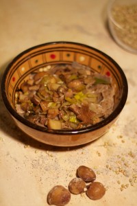 Ho impastato per bene e quando si è formata una bella palla ho continuato a lavorarla sulla spianatoia di legno in modo che perdesse l’umidità in eccesso. Diciamo che a un certo punto diventa quasi elastica: certo, non è che si può pretendere molto da un impasto senza glutine e senza uova…ma regolando con l’olio, e dopo una mezz’oretta di riposo, si riesce a stendere bene col mattarello. Io preferisco le forme irregolari, quindi non ho adoperato la macchinetta né per tirare la pasta, né per ricavare le tagliatelle: ho fatto tutto a mano per dare più un’idea di casareccio, ma volendo la si può usare (con un po’ di pazienza, perché la farina di grano saraceno tende a dividere l’impasto e può capitare che tirandolo con la macchinetta si sgretoli un po’!). Nel frattempo ho fatto un bel soffritto con porro, olio EVO, qualche fungo secco ammollato nell’acqua e delle castagne fatte a pezzettoni (quelle già bollite prese al supermercato: se fosse stato novembre, avrei usato le castagne vere!!!). Ho messo sul fuoco un pentolone di acqua salata con una bella foglia di alloro e raggiunto il bollore ho buttato le tagliatelle. Dopo pochissimi minuti erano pronte! Le ho impiattate, immortalate in qualche modo, e mangiate. Direi buone, anche se un po’ appiccicose…Forse forse renderebbero meglio sotto forma di orecchiette!