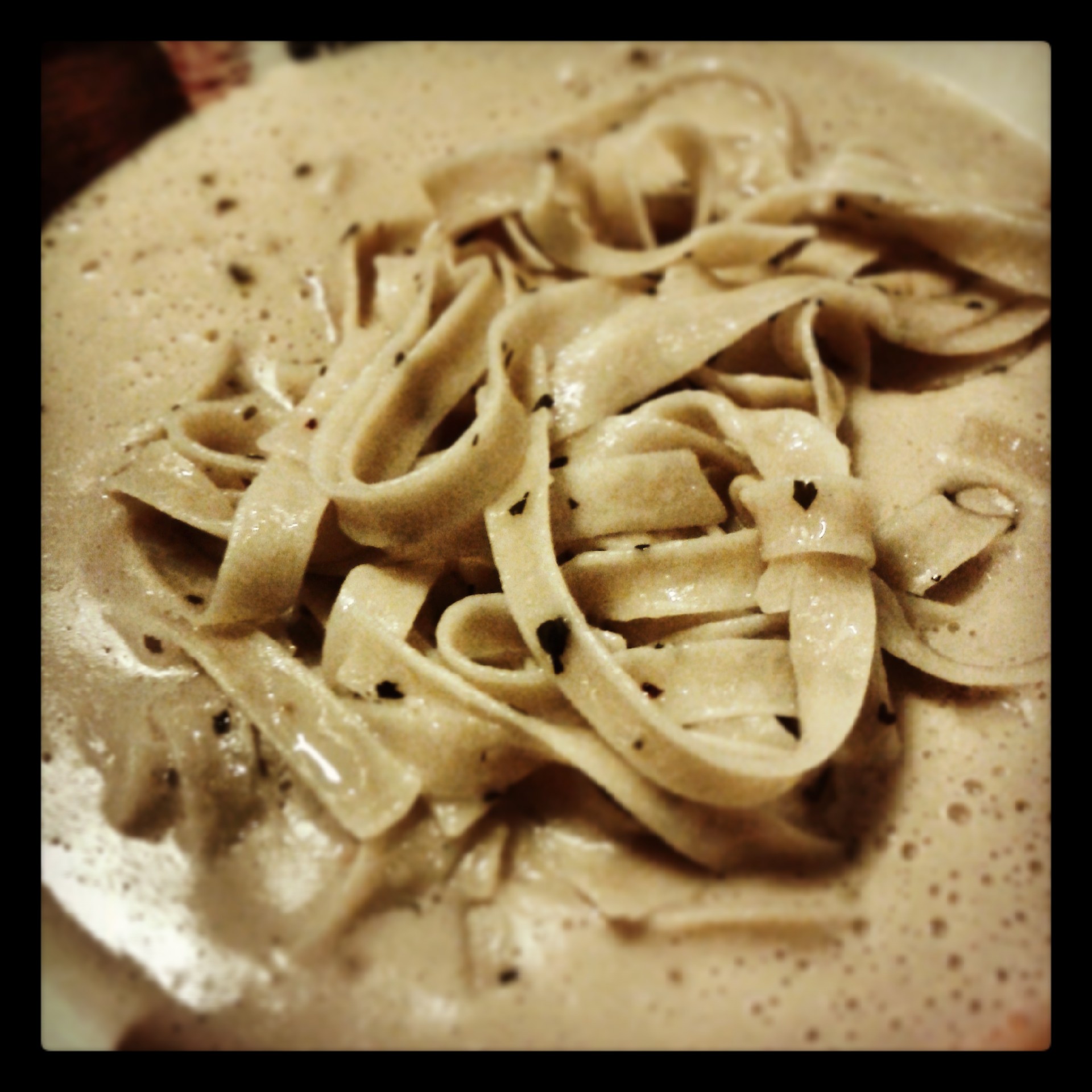 Per finire ho versato la crema di cicerchie nei piatti e ho aggiunto, in ciascuno, una porzione di tagliatelle cosparse di pepe appena macinato.