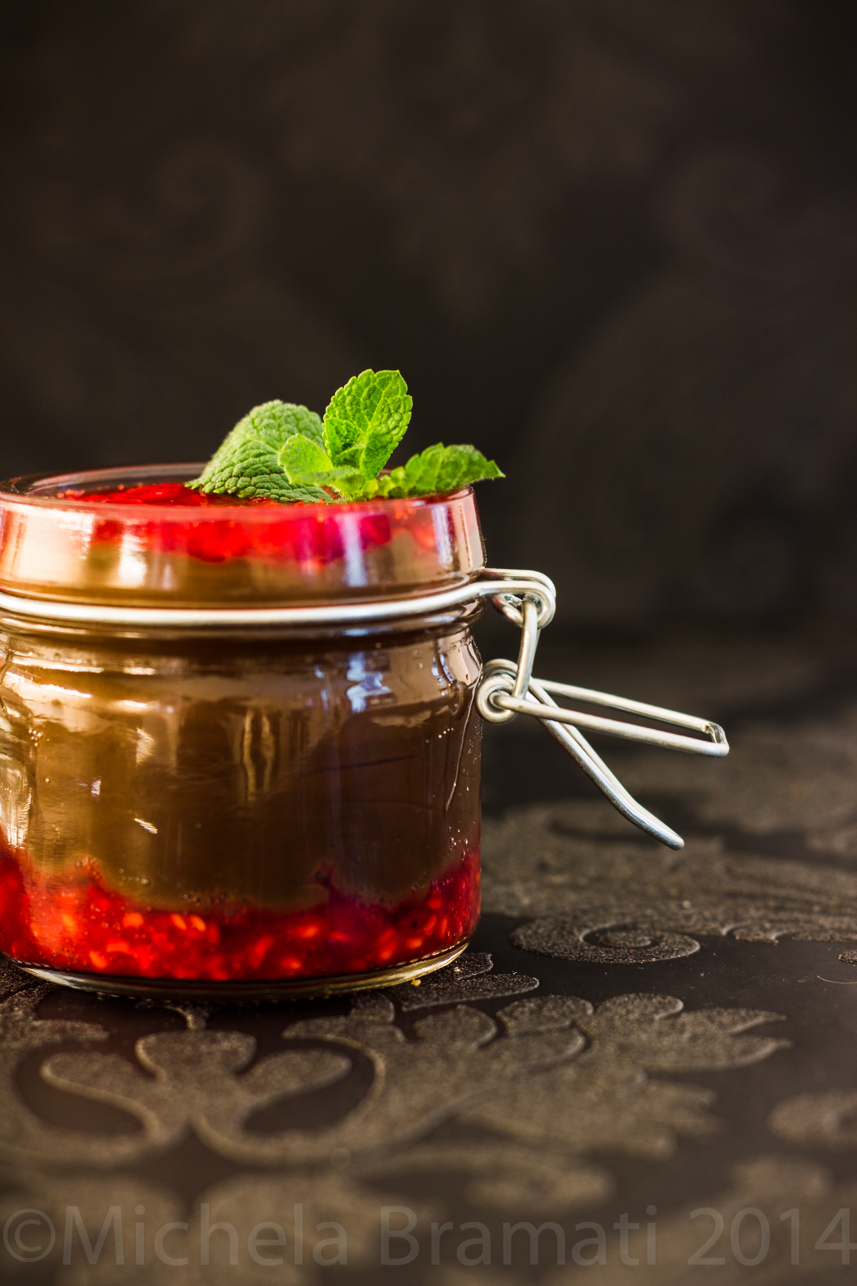 Quindi ho riempito ciascun vasetto con un po’ di purea di lamponi sul fondo, ho aggiunto il budino al cioccolato e ho completato con altri lamponi.